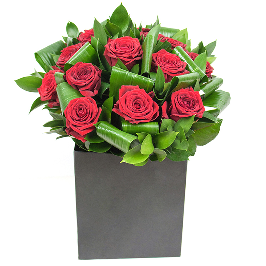 Immerse yourself in the splendor of our stunning bouquet, showcasing rich red roses intertwined with vibrant aspidistra leaves and graceful ruscus. This unique design brings elegance and charm to any setting.