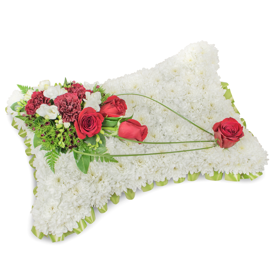 Honor your loved ones with our beautiful tribute sympathy bouquet, featuring a graceful mix of white chrysanthemums, red roses, white freesias, dark red carnations, dianthus, and bear grass. Each flower is hand-selected to ensure superior freshness and quality.